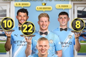 體育資訊12月15日訊 哈蘭德加盟曼城以來攻入147粒進球,Score90統(tǒng)計了球員在曼城助攻哈蘭德的次數(shù),并列出前三名榜單,德布勞內(nèi)22助居首。
