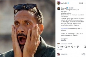 曼聯(lián)名宿費(fèi)迪南德社媒曬出自己一臉驚訝的照片,并寫(xiě)道:“我們剛剛看了一場(chǎng)多么瘋狂的比賽!心情復(fù)雜。以防守球員的身份來(lái)說(shuō)——我(要是還在場(chǎng)上)肯定會(huì)大喊大叫!”