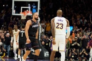 3、最后3秒,經(jīng)教練挑戰(zhàn)后回看復(fù)核,判定對布克的三分犯規(guī)吹罰無誤。布克在詹姆斯起跳舉球出手時,主動接觸其右臂/手腕部位。
