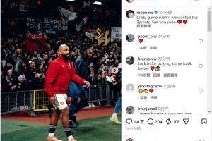 姆伯莫社媒曬出比賽照片,并寫道:“瘋狂的比賽,盡管我們本希望全取三分,回頭見!”