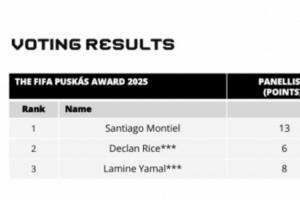 根據國際足聯(lián)官方公布的票數統(tǒng)計結果,蒙鐵爾以21分位列第一,賴斯和亞馬爾同積17分分列二三,官方僅給出了前三名的投票結果。