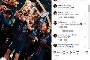 在巴黎身披7號的克瓦拉茨赫利亞社媒曬出捧杯照片,慶祝球隊奪冠,配文:“7是不錯的數(shù)字?!?/p>