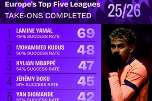 體育資訊12月18日訊 數(shù)據(jù)機(jī)構(gòu)squawka統(tǒng)計(jì)了本賽季五大聯(lián)賽成功過人情況,巴薩邊鋒亞馬爾獨(dú)自領(lǐng)跑。