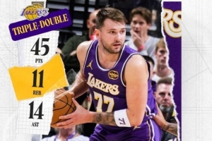 賽后湖人發(fā)布東契奇數(shù)據(jù)海報,并寫道:“湖人生涯的首個40+三雙?!?/p>