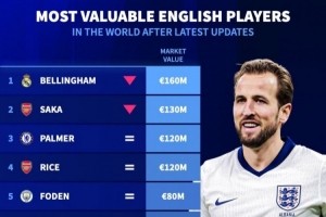 英格蘭球員最新身價(jià)榜:貝林壓薩卡居首,帕爾默、賴(lài)斯并列第三
