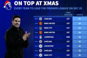 體育資訊12月19日訊 《轉(zhuǎn)會(huì)市場(chǎng)》列出了近年英超圣誕榜首球隊(duì)的積分及最終排名,近7年僅3隊(duì)最終奪冠。
