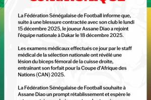 國家隊醫(yī)療團(tuán)隊今日進(jìn)行的檢查顯示,阿薩尼·迪奧右大腿股二頭肌受傷,無法參加本屆非洲杯。